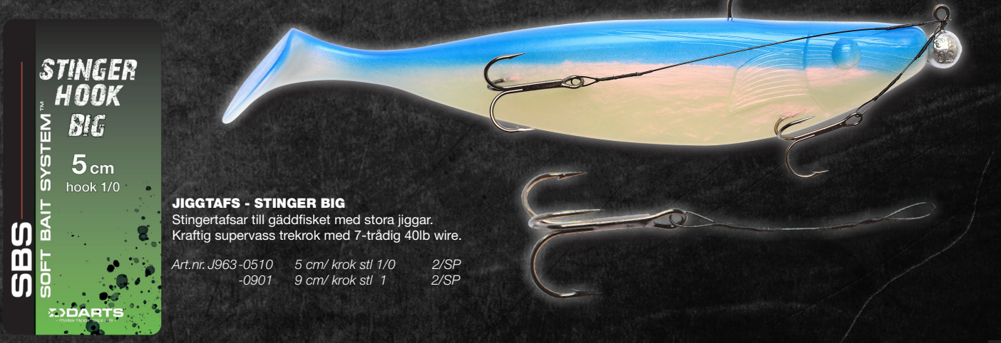 Stingertafsar till gäddfisket med stora jiggar. Kraftig supervass trekrok med 7-trådig 40lb wire.