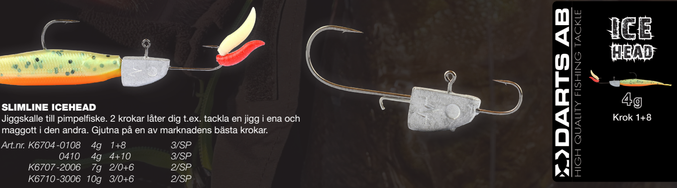 Jiggskalle till pimpelfiske. 2 krokar låter dig t.ex. tackla en jigg i ena och maggott i den andra. Gjutna på en av marknadens bästa krokar.