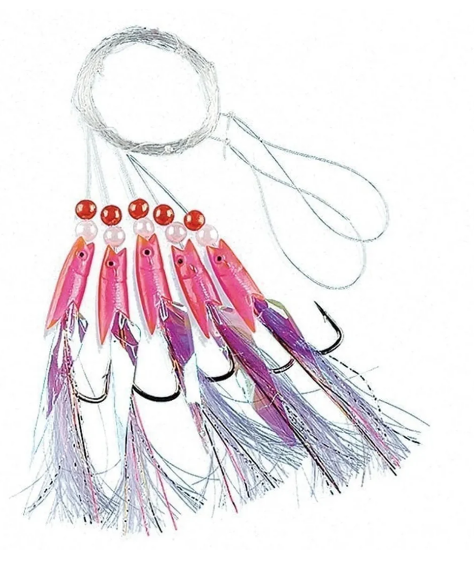 Häckla med fem krokar i rosa gummi kombinerar ljust tinsel och reflekterande tape för maximal synlighet och lockeffekt. Den starka färgkontrasten och blänket gör denna häckla extremt effektiv vid fiske efter makrill, sill/strömming och andra stimfiskar.
