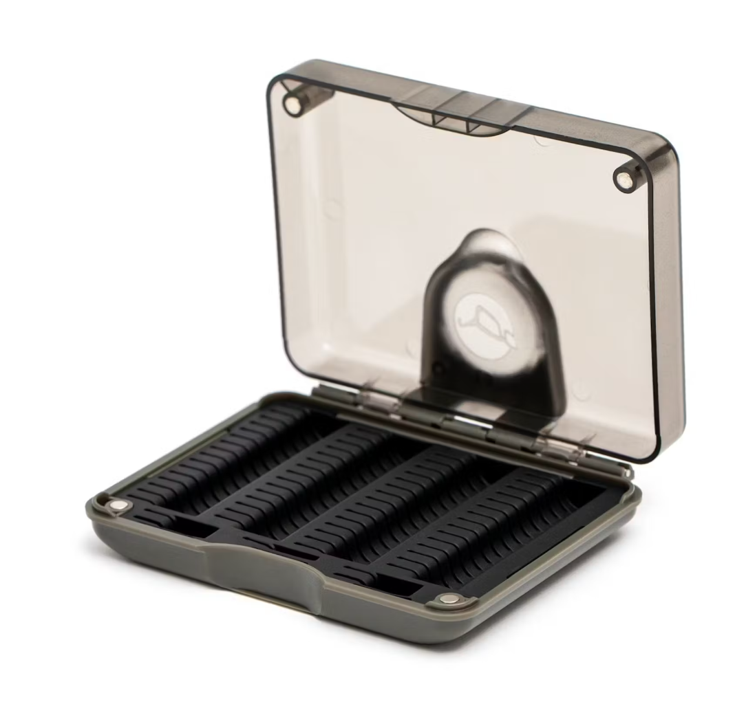 Själva lådan är gjord av slagfast hårdplast, med magnetfästning för att säkerställa att den inte kan öppnas under transport, men är väldigt lätt att öppna och stänga när du behöver det. Locket har en inbyggd, uppfällbar förstoringslins, som kan användas för att kontrollera krokpunkter, och hålls på plats av ett magnetiskt fäste när det inte används.
