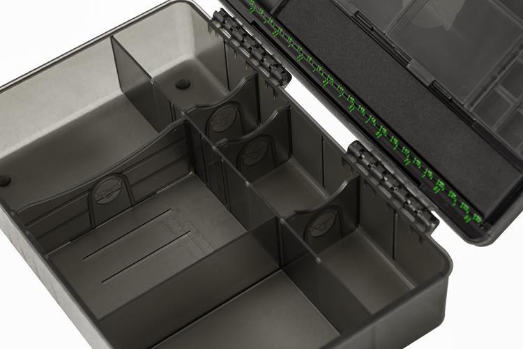 Huvudfacket är öppet och uppdelat i sektioner med flyttbara avdelare, så att du själv kan anpassa utrymmet efter din utrustning. Boxen är förberedd för att passa bland annat hooklink-spolar, krokaskar, zig-spolar, Leader Safe samt verktyg som sax och betesnålar. Här finns även plats för Mini Compartment Boxes (säljs separat), som ger ännu fler möjligheter att organisera mindre detaljer.