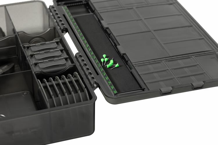 Boxen är fullt anpassningsbar tack vare ett brett utbud av tillbehör som passar perfekt i den. I locket finns 29 inbyggda fack med genomskinliga lock som håller innehållet säkert på plats och gör det enkelt att se vad som finns i varje fack. Dessa lämpar sig utmärkt för smådelar som swivlar, riggringar, Heli-Safe, krympslang och liknande tillbehör. I locket finns även en riggbräda med fräst krokhållare och skuminlägg, vilket gör det möjligt att förvara färdiga riggar upp till 9 tum. Dessutom finns en tydlig linjal med grön markering som underlättar vid riggbygge och mätning.