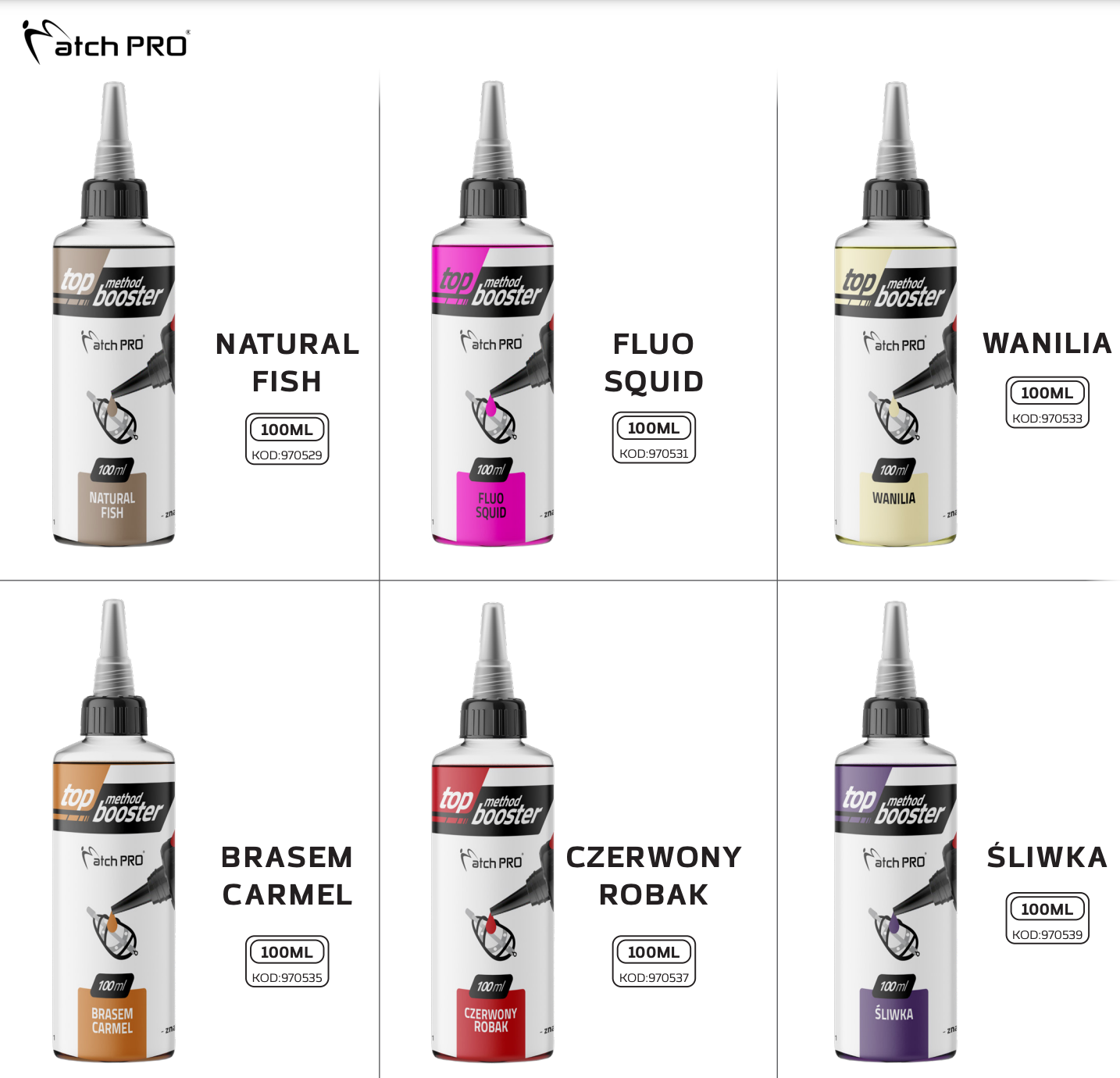 Boosters av högsta kvalitet utvecklade av ledande metodmatarkonkurrenter i Polen. De har det naturligt en stark arom som optimalt förstärker beteeffekten. Den specifika färgen är också en extra stimulans för fisk, som vi kan anpassa till en given fiskeplats. TOP METHOD BOOSTER skapades för att hälla vatten på en färdig metodkorg precis innan kastning. Inget mindre vår booster kommer dock att fungera perfekt som en booster för beten, korn på håret, PVA-påsar och betesbollar. Ett så brett utbud av applikationer gör det till ett utmärkt vapen i varje sportfiskares arsenal! Vi har ett val 27 olika smaker och färger i 100 ml förpackningar med en mycket bekväm dispenser.