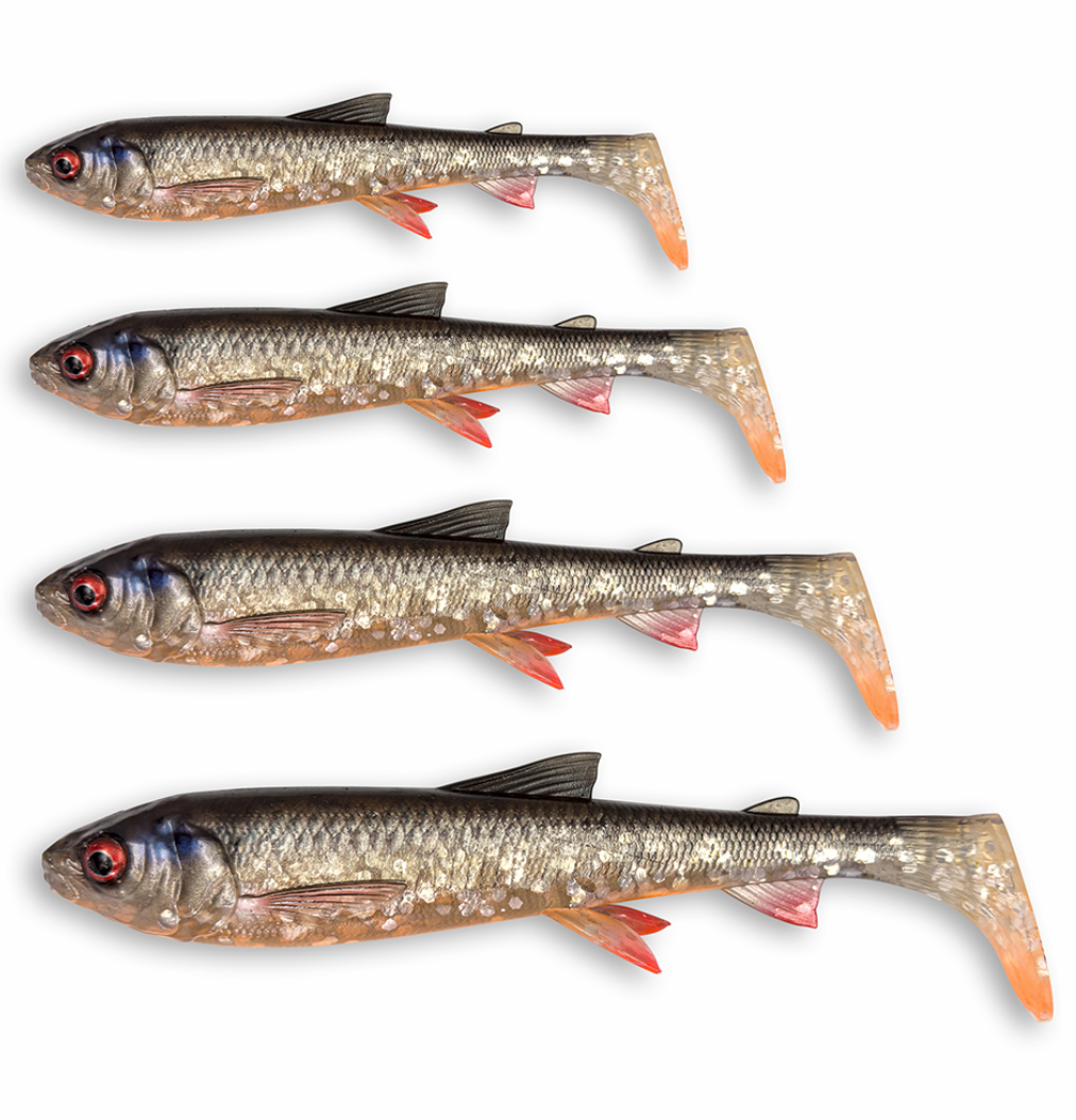 Baserat på skanningen av en äkta vit fisk, har denna lösa kroppspaddel med obefläckade detaljer och en fantastisk rullande och sparkande action. Det skrymmande huvudet och framkroppen trycker mycket vatten och ger draget stor stabilitet på grund rigg. De ledade och superrealistiska fenorna lägger till fantastisk sekundär action till den stora sparkande paddelsvansen, som också håller en bullrig glasskalla för extra attraktion. Tillverkad av ett supermjukt PVC-material med fantastiska färger och en utlösande doft.