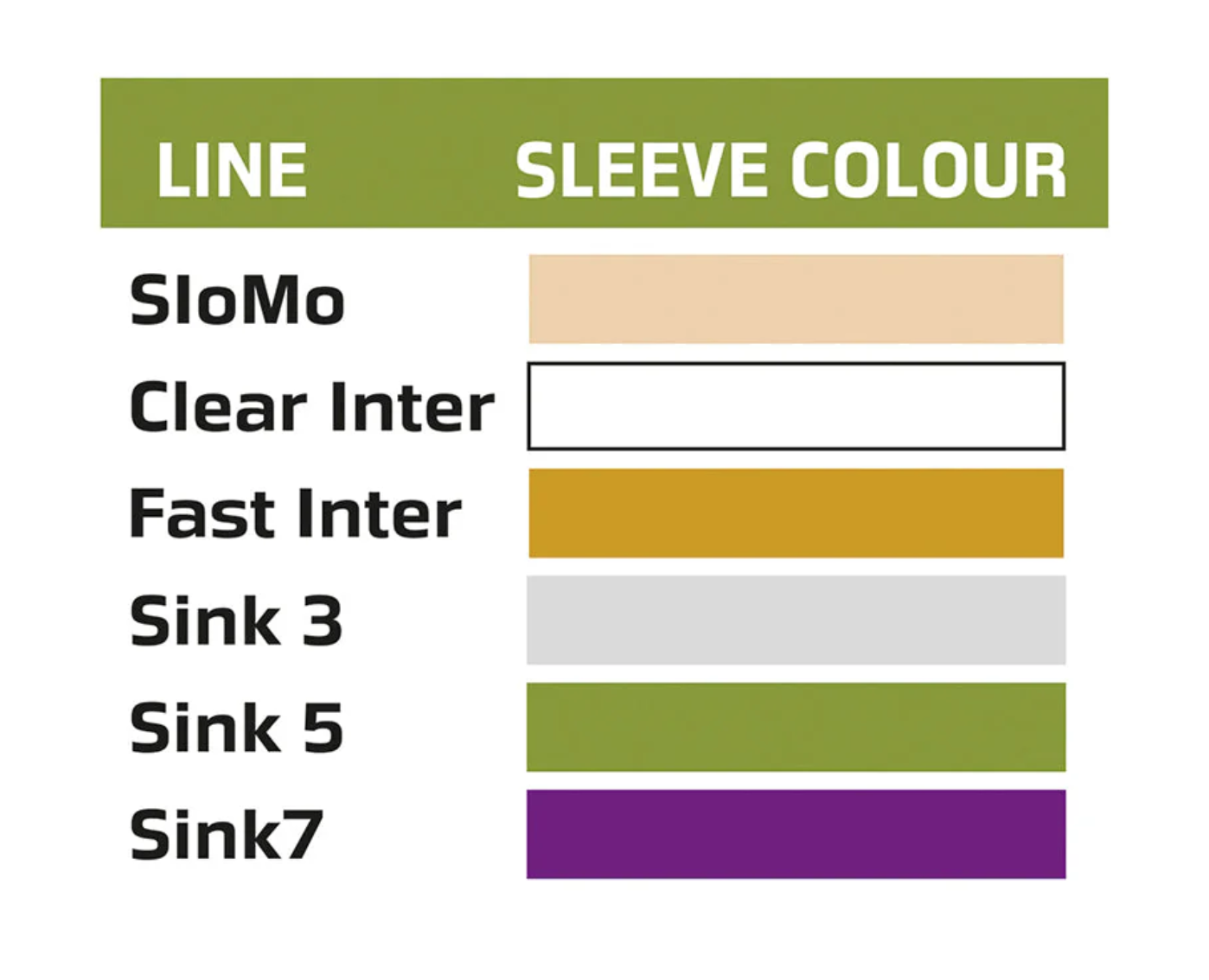 Linorna finns i SloMo, Fast Inter, Sink 3 och Sink 5, och alla dessa har samma färg. Detta för att hålla ditt hemliga vapen dolt från nyfikna blickar, eftersom det blir omöjligt att avgöra sjunkhastigheten på avstånd. Färgen på hylsan bakom tafsringen samt texten på den gör att bara du vet vilken sjunkhastighet du använder. Kärnan med låg stretch gör att du bättre känner huggen och överför kastenergin mer effektivt än traditionella linor. Den färdiga öglan i bakänden gör det enkelt att fästa linan till backingen, och texten bakom tafsringen hjälper dig att identifiera linans vikt.