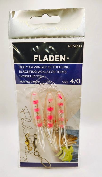 Detta är en kraftig djuphavsrigg utrustad med en bläckfiskimitation i vitt och rosa, färger som syns bra på stort djup och lockar rovfisk. Kroken i storlek 4/0 passar för större fiskarter och riggen är anpassad för tufft fiske i saltvatten. Den mjuka bläckfiskkjolen rör sig naturligt i vattnet och imiterar levande bete, vilket gör den effektiv vid djuphavsfiske efter exempelvis torsk, hälleflundra och andra bottenlevande predatorer.