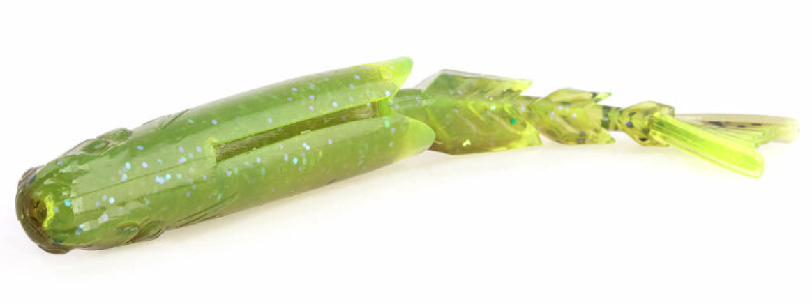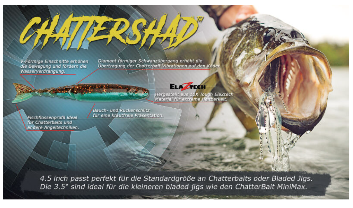 Chattershad 3.5” från Z-Man är en V-tail softbait med otroligt livlig gång tack vare sin ribbade kropp och naturtrogna stjärt. Betet är utvecklat främst som trailer till chatterbaits, men fungerar lika bra som soft jerkbait, på dropshot eller andra finesse-riggar. De smarta slitsarna i buk och rygg gör att den enkelt kan riggas weedless med en WideGap-krok. Storlek och färger matchar perfekt med Z-Man Mini Max Chatterbait.
